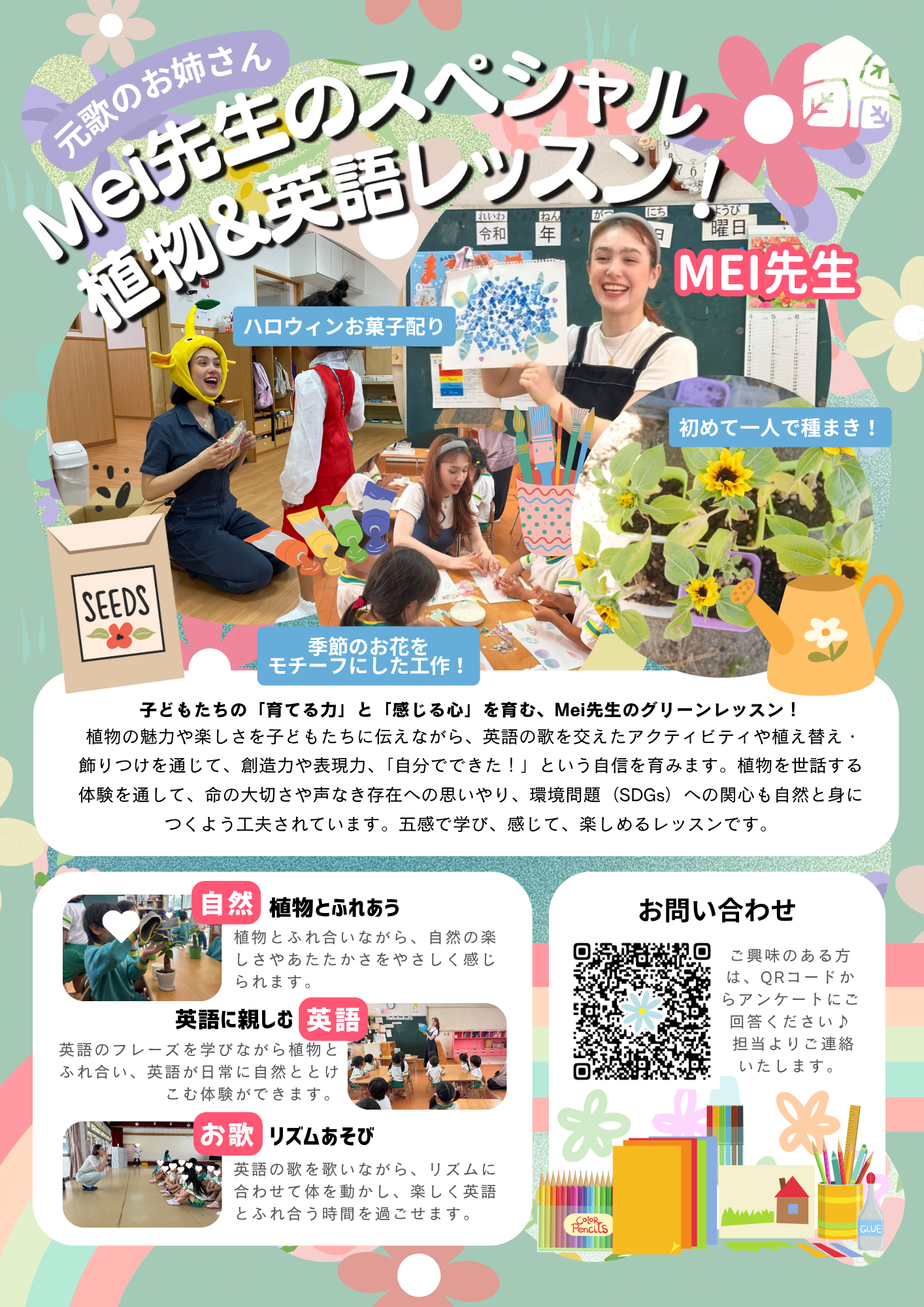 Mei先生は、日本と海外での教育・音楽活動の経験を活かし、「植物 × 感性 × 言葉 × つながり」をテーマにした独自のバイリンガルプログラムを展開。